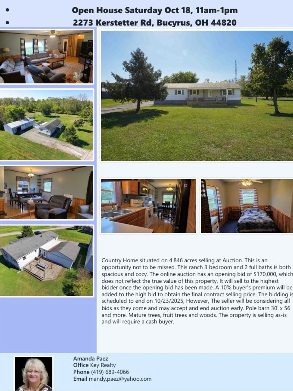 Country Home situated on 4.846 acres selling at Auction. This is an opportunity not to be missed. This ranch 3 bedroom and 2 full baths is both spacious and cozy. The online auction has an opening bid of $170,000. It will sell to the highest bidder once the opening bid has been made. A 10% buyer's premium will be added to the high bid to obtain the final contract selling price. The bidding is scheduled to end on 10/23/2025, However, The seller will be considering all bids as they come and may accept and end auction early. Pole barn 30' x 56 and more. Mature trees, fruit trees and woods. The property is selling as-is and will require a cash buyer. https://amandapaez.ikeyrealty.com/p/2273-Kerstetter-Rd-Bucyrus-OH-44820/dmgid_181609407